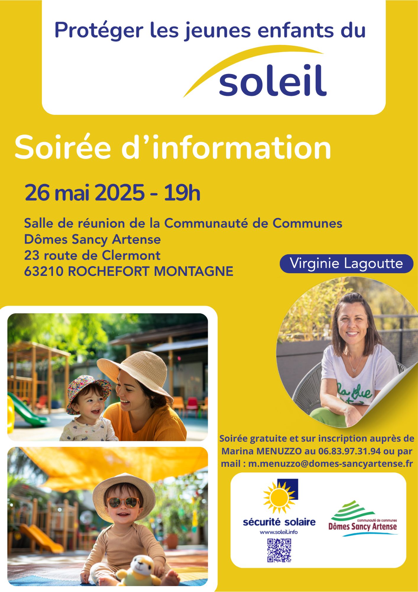 La Communauté de Communes Dômes Sancy Artense en collaboration avec l’ARS, organise une soirée d’information à destination des familles et des professionnels de la petite enfance / enfance jeunesse sur « la protection solaire des jeunes enfants ».